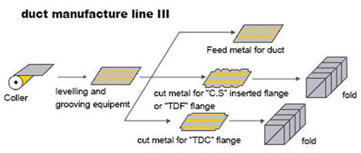 生產Ⅲ線是由上料架、調平壓筋機、沖尖口和沖方口油壓機、液壓剪板機、液壓折邊機所組成。電器控制部分采用全電腦控制,該控制系統具有閉環反饋系統,生產精度和穩定性明顯升高。其大工作速度為10米/分。長度誤差為±0.5mm,對角線誤差 ±0.8mm。 本系統可單班生產1000M2方型風管能力。